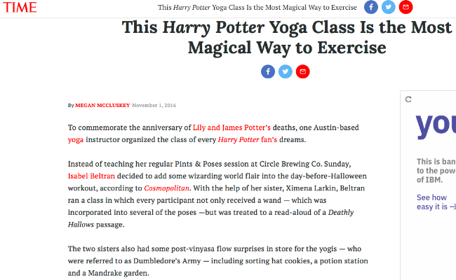 - Buzzfeed: Harry Potter Yoga Is A Thing And You'll Want To Apparate There Right Away